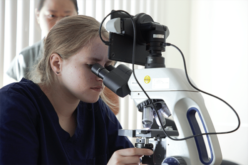 LEAP INTERN CLARE EXAMINES A SPECIMEN UNDER A MICROSCOPEIncreasing the talent pipeline in shelter medicine through programs like LEAP ultimately provides shelters and rescues with their most valuable resource – qualified staff who are trained and ready to meet the unique needs of the shelter environment. “I feel that I have made a lot of progress toward my goals of getting hands-on experience with animals.” LEAP Intern Clare writes. “I have grown more confident in my skills and have expanded my knowledge of not only shelter medicine but all aspects of working in an animal shelter.”